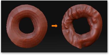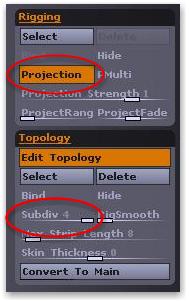 Yeni topoloji üzerine projeksiyon yapılması ya da yukarıdaki gibi yeni topolojinin displacement map’e verebileceği tepkiyi test etmek için, Rigging kısmında yer alan Projection seçeneğinin işaretli olması gerekmektedir. Tabii ki sonucun yüksek yüzey sayısında daha iyi sonuç vereceği yaklaşımından hareketle, yeni topolojimizin Subdiv sayısınıda arttırmakta fayda vardır. Bunuda Topology kısmındaki Subdiv değerini arttırarak yapabilirsiniz. “a” tuşuna bastığınızda sonucu görebilirsiniz.