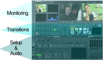 Yukarıdaki resimde de görüldüğü gibi arayüzü üç kısma ayırmak mümkündür. En üst kısımda vectorscope dahil, kaynaklarımızı izlememizi sağlayan sanal monitörler, hemen altında kaynaklar arasında geçişi sağlayan kısım ve en alt kısımda, sanal VTR’leri, diğer bilgisayar ekranlarını yayına verirkenki ayarlamaları, ses mikseri ve sanal stüdyo özelliklerinin ayarlandığı Setup & Audio kısmı yer almaktadır.
