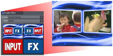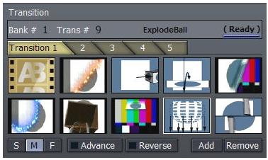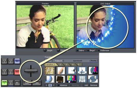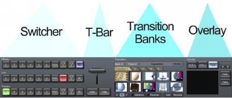 T-Bar kolunu hareket ettirmenizle yukarıdaki resimde görüldüğü gibi, bir kaynaktan diğerine geçiş gerçekleşir. T-Bar’da yer alan Auto tuşuyla, kolu hareket ettirmeden geçişi, Take ile Cut yani anında geçişi sağlarsınız. Geçiş sırasında kullanacağınız DVE (Digital Video Effects) T-bar’ın hemen sağında Transition Banks kısmından seçilebilir. Yaklaşık olarak birbirinden güzel 500 DVE ile kaynaklar arasında geçiş yapabilirsiniz. Bu geçiş efektlerinin bazıları 2D bazıları 3D efektlerdir. Geçiş Efektleriyle ilgili en güzel özellik ise, sizin bu tür geçiş efektlerini hazırlayıp, kullanabilmenizdir. Evet yanlış okumadınız, 3D ve 2D DVE’leri kendi programınıza, yapacak olduğunuz sunuma uygun olarak hazırlayıp, istediğiniz zaman Realtime olarak kullanabilirsiniz.