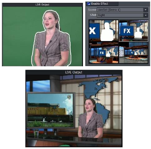 Sistemin en etkileyici yönüyse, yansıma, kırılma, gölge gibi etkileri realtime olarak gerçekleştirmesi. Yukarıdaki resimde Sunucunun gölgesi ve masadan yansıyan görüntüsüne dikkatinizi çekerim. Aynı şekilde ekranda yer alan Tren görüntüsü bir başka kaynak ve bu kaynakta hem masada yansıyor ve hem de masanın üzerindeki bardakta kırılıyor. Bu küçük ama önemli unsurlar, sanal stüdyonun gerçekçiliğini çok etkiliyor ve bir anda gerçek bir stüdyoda yayın yapıldığı hissini uyandırıyor. Oysa tüm bunlar, arka zemini yeşil (mavi) olan, oldukça dar bir alandan başka bir yerde gerçekleşmiyor. Hatta farklı açılar seçilerek, mekanın çok daha derin ve etkileyici görünmesi bile sağlanabilir.